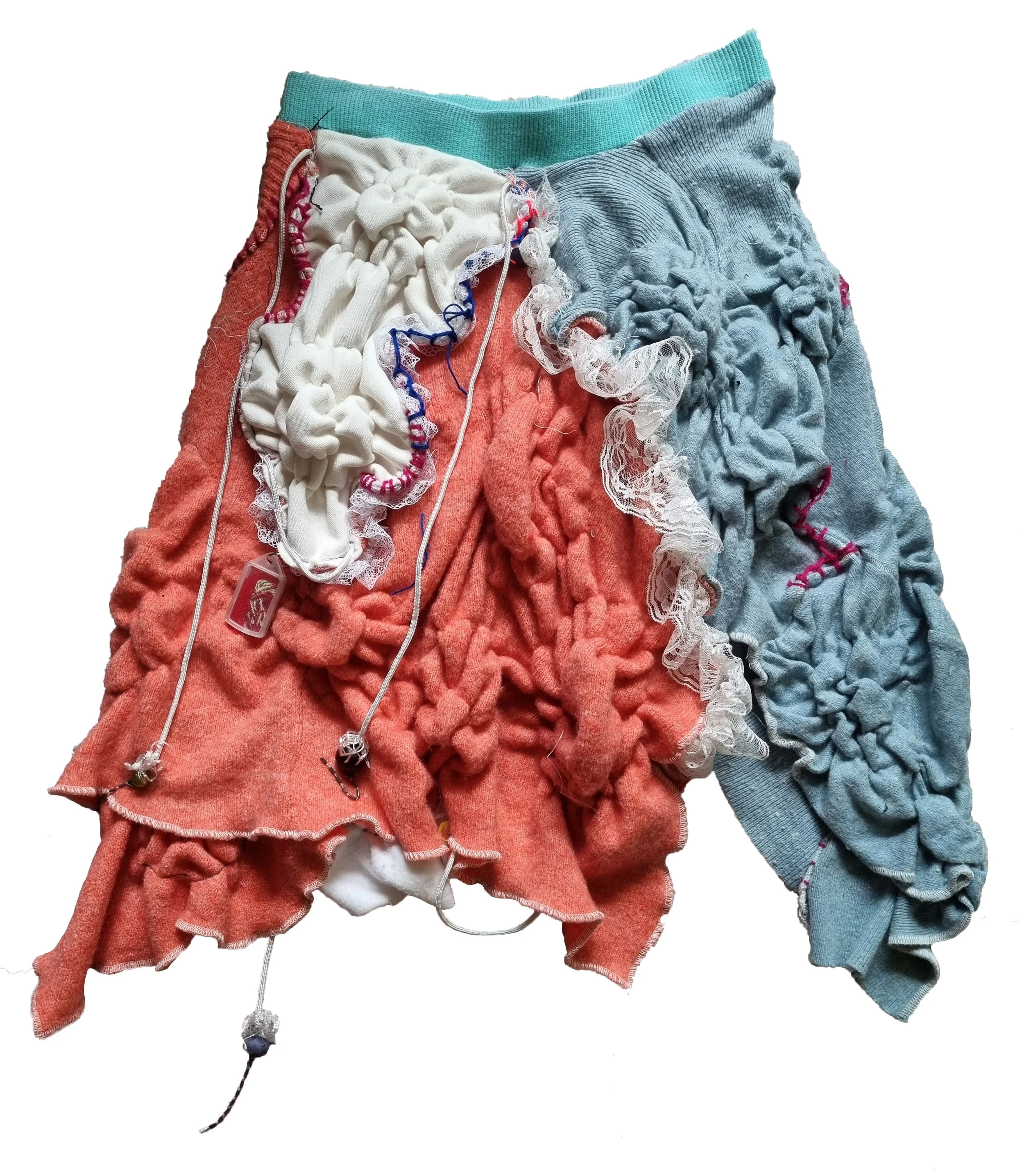 Patchwork Keychain Skirt, machine-embroidered ruching and embellished with stuffed keychain details
